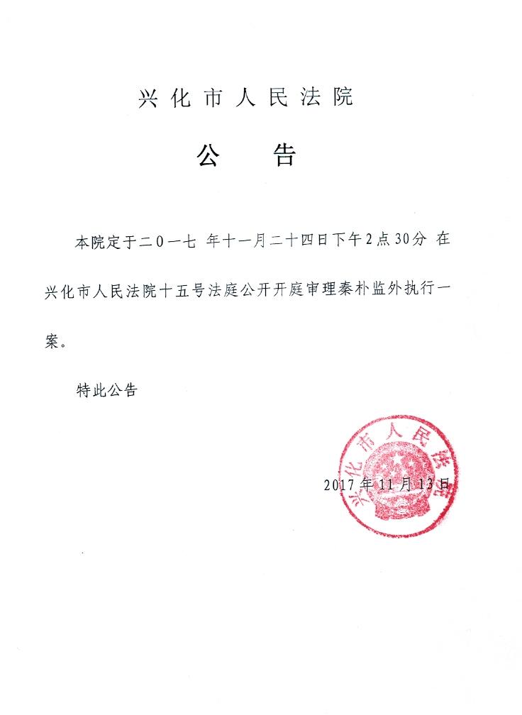 关于公开开庭审理秦朴监外执行一案的公告